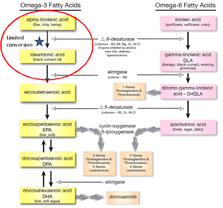 And it’s not something that can be remedied by eating more fish.  You would have to eat between 6 and 24 servings of fish each WEEK in order to get the right amounts of omega-3 fats.
